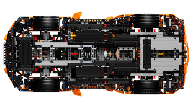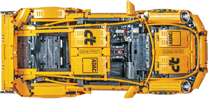 Как настоящий Porsche 911 GT3 RS, оранжевая моделька оснащена задним спойлером с регулируемым углом атаки. На месте и красные пружины подвески, и детализированные тормозные суппорты, и чемодан в багажнике. Внутри — спортивные сиденья, рабочая коробка передач (!) и рулевое колесо с подрулевыми переключателями. На крышке бардачка — уникальный серийный номер. Инженеры ADAC собрали все тщательно, отступив от инструкции всего один раз: в салон Lego-Porsche они установили маленькую видеокамеру. Им пришлось повозиться: в оппозитной «шестерке» даже поршни движутся.