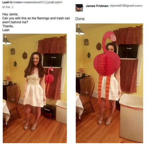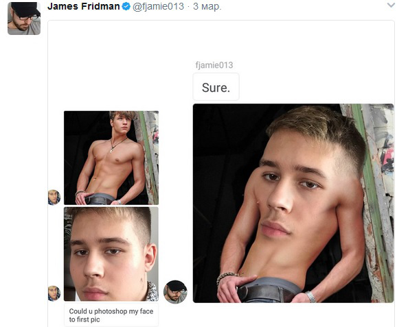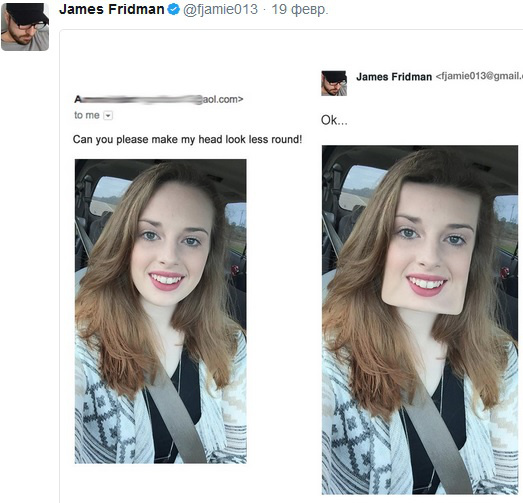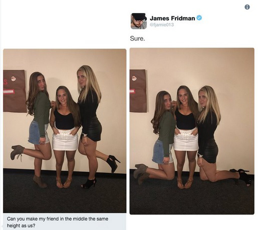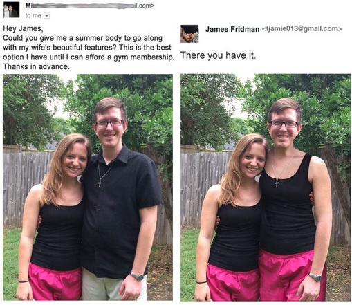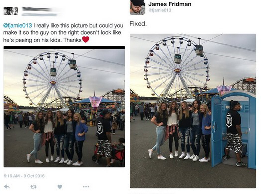 Мы уже рассказывали о графическом дизайнере, готовом исполнить любую прихоть читателей своего @«Твиттера». Джеймс Фридман не жалеет времени, сил и фотошопа, чтобы улучшить фотографии, исходя из просьб поклонников его таланта.