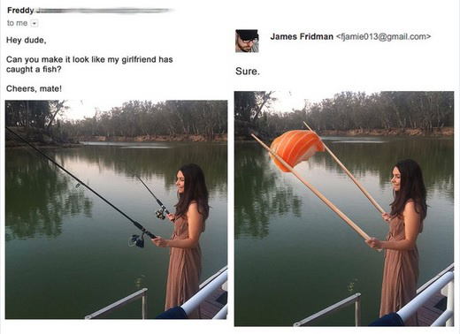 — Привет, чувак! Сделай так, будто моя девушка поймала рыбу!
