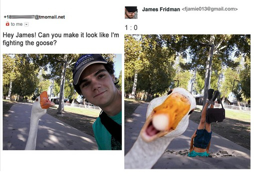 — Привет Джеймс! Сделай так, будто я дерусь с гусем!