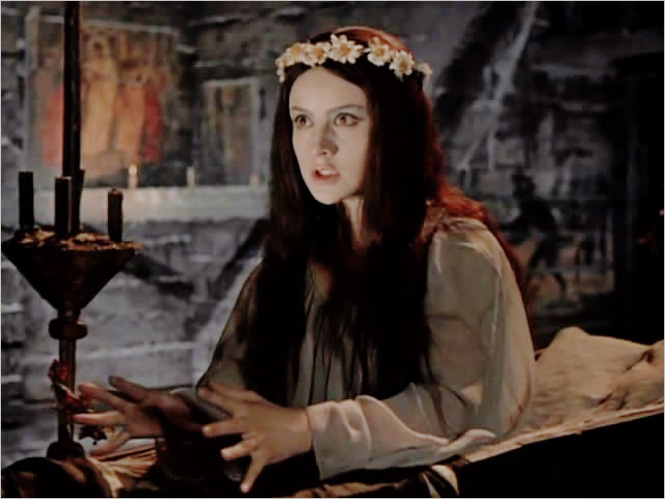 Вокруг носятся бесы, страшнорожим виям поднимают их кошмарные веки, но единственный реально пугающий персонаж в сцене — это густо набеленная красотка Варлей, которая неожиданно открывает свои мертвые блестящие глазки.
