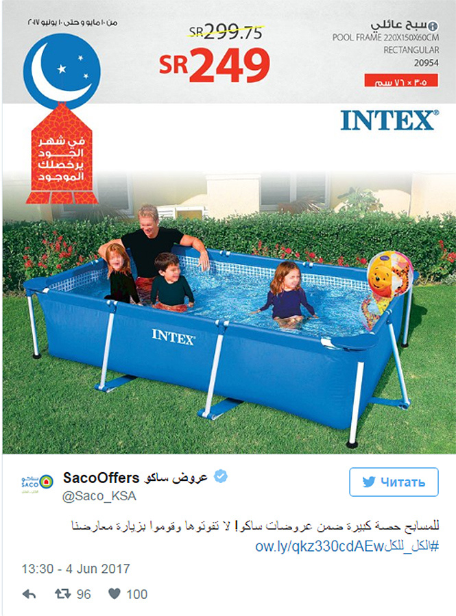 Работающий в Саудовской Аравии магазин стройматериалов и аксессуаров выложил на своем сайте на первый взгляд вполне обычную (хоть и слегка корявую) картинку с изображением семейного бассейна. Да еще со скидкой в 50 саудовских риялов. Надо брать!