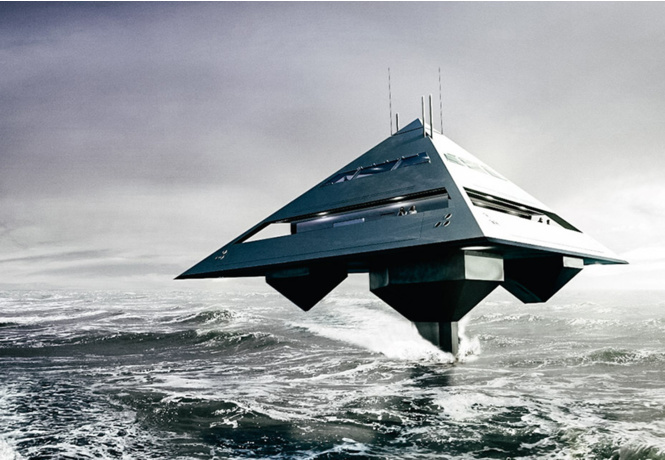 Архитекторы должны были уместить в яхту большой объем, не делая ее с «Титаник». Но расширение корпуса привело бы к потере в скорости. Поэтому авторы пошли на риск: создали корпус в виде пирамиды, но вынесли над водой и поставили всю затею на подводные крылья. В итоге площади кают и салонов огромные, а скорость концепта предполагается выше, чем у обычных яхт той же мощности.
