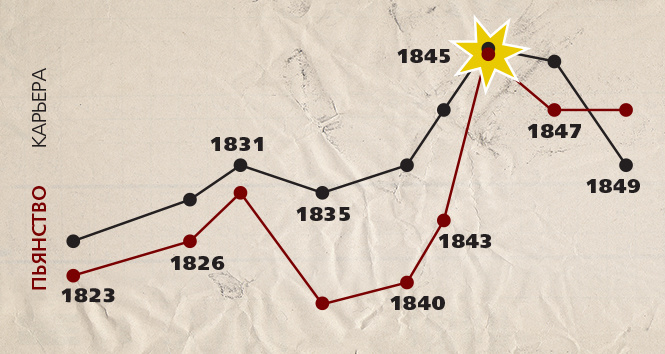 1845 Творческий и алкогольный пик. Когда По принес «Ворона» в «Грехемс мэгэзин», он выглядел настолько опустившимся от пьянства, что редакторы, испугавшись, поначалу отвергли поэму.
