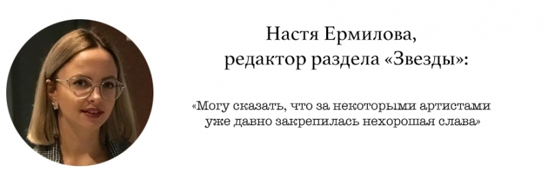 «Я с депутатами не работаю, но общаюсь с артистами и могу сказать, что за некоторыми уже давно закрепилась нехорошая слава. Мне однажды один очень популярный певец (и кстати, в возрасте, что его вовсе не останавливает) предлагал приехать к нему в загородный дом, якобы только там ему удобно дать мне интервью. На мои доводы о том, что я без машины и лучше встретиться на нейтральной территории, он ответил, что готов забрать меня у ближайшего к его дому метро и довезти до дома.