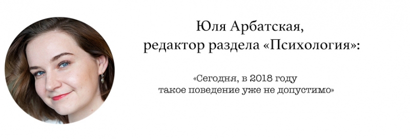 А во-вторых, время идет, настроения в обществе меняются. Еще несколько лет назад домогательства считались чем-то совершенно нормальным, в российском законодательстве до сих пор нет даже такой статьи, предполагающей наказание за подобное поведение. Но сегодня, когда все больше говорят о равных правах, о гендерном равенстве и взаимном уважении, становится недопустимым, чтобы мужчина, тем более наделенный властью, так себя вел по отношению к женщине.