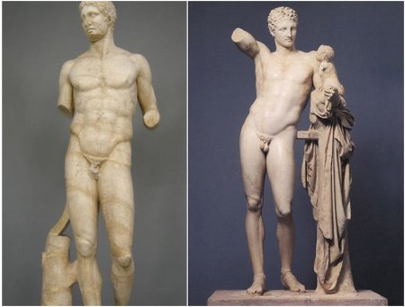 Слева — римская копия с греческой статуи V века до н. э., справа — «Гермес с младенцем Дионисом», Пракситель