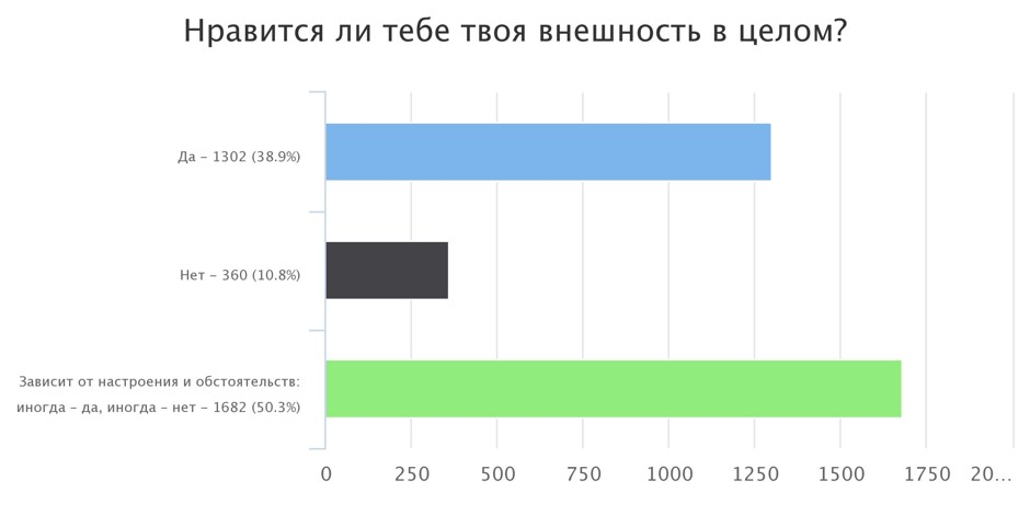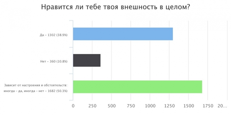 В целом, женщинам сложно однозначно ответить на вопрос, нравятся ли они себе. Степень удовлетворенности своей внешностью зависит от настроения и других обстоятельств — такой ответ дали 50,3% опрошенных.