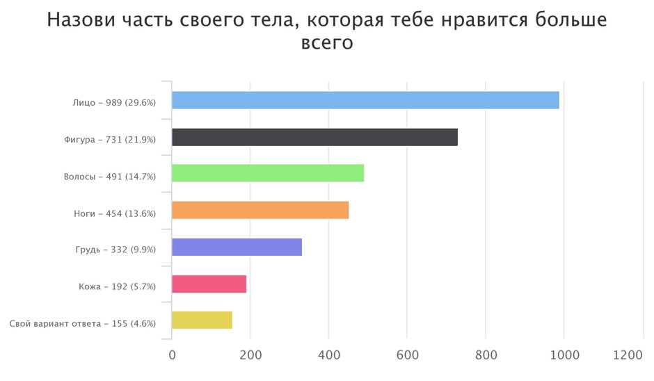 Женщины охотно рассказали о любимых частях своего тела: «глаза», «грудь и шея», «палец на ноге», «только уши», «запястья». В ходе опроса также выяснилось, что у читательниц @Леди отличное чувство юмора. Многие в этот список включили «характер», «мозг» и «смех».
