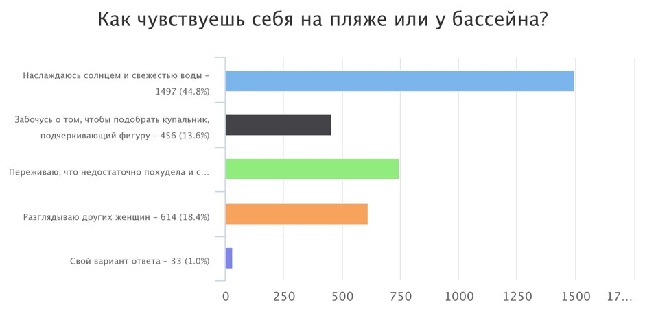 Многие женщины сопроводили ответы комментариями: «стараюсь не ходить на пляж», «прячусь ото всех», «переживаю из-за своей бледной кожи», «втягиваю живот», «переживаю, что слишком худая».