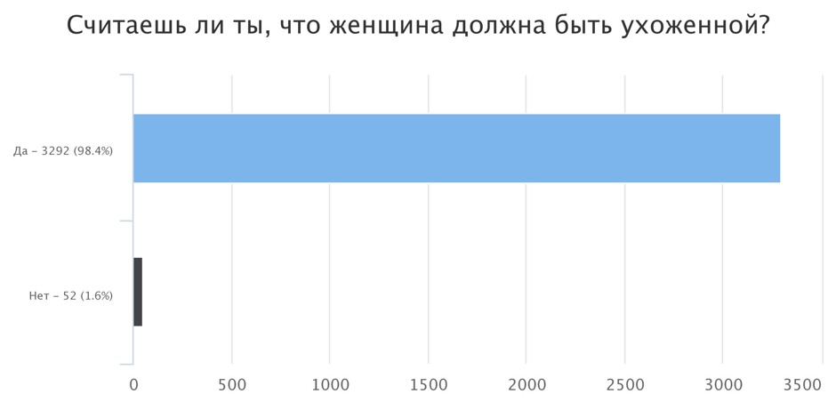 По мнению 89,5% опрошенных, женщина должна быть красивой. Большинство — 94,8% — уверены, что женщина должны быть еще и ухоженной.