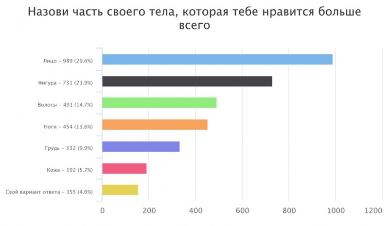 Если спросить женщин о том, какая часть их тела нравится им больше всего, то они назовут лицо. Этот пункт отметили 29,6% респонденток. А чаще всего опрошенные недовольны своим телом — так высказались 27,2% читательниц.