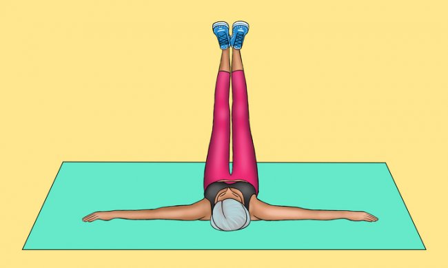 Поднимите ноги от земли сначала под углом 45°, используя мышцы живота, затем доведите до 90° и ненадолго задержитесь.