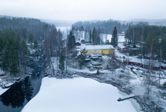Мы в городе Пуумала — останавливаемся в большом туристическом комплексе Саханлахти. Здесь нам предстоит провести полдня и ночь. Впереди — экскурсия к озеру, ужин, баня по-черному и купание в бассейне с подогретой водой. Нужно набраться сил, поэтому администратор отеля дает каждому ключ от номера. Кстати, жить предстоит не в гостинице, а в маленьких домиках прямо у озера.