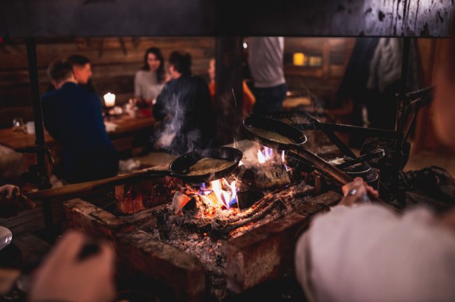 Блины, приготовленные над огнемВечер заканчивается сауной по-черному. Она топится несколько часов, температура не превышает 70-80 градусов, весь дым идет не наружу, а внутрь. Из-за дыма в сауне никого не видно. Карабкаюсь по лестнице и пытаюсь не задеть рукой стены — они покрыты черной сажей. Приземляюсь на верхнюю полку и наслаждаюсь горячим воздухом. После — выбегаю на улицу и прыгаю в бассейн с теплой водой.