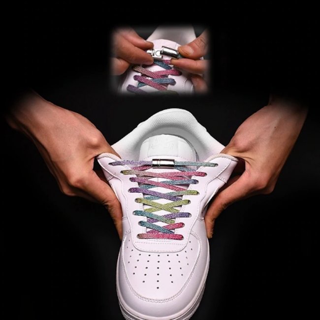 Оригинальные эластичные шнурки с магнитной застежкой позволяют без труда преобразить повседневную и спортивную обувь. Продавец предлагает множество ярких расцветок, а также прилагает миниатюрную отвертку для закрепления магнитов. Замочек, судя по отзывам, хорошо держится.