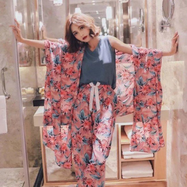 Если ты любишь переодеваться (или тебе то жарко, то холодно), убивай двух зайцев (разумеется, метафорично) сразу. В комплекте есть шорты, брюки, футболка без рукавов и халат из вискозы, так что выбор гарантирован. В отзывах обещают, что ткань приятная и мягкая к телу, а пижама легко и быстро разглаживается утюгом.