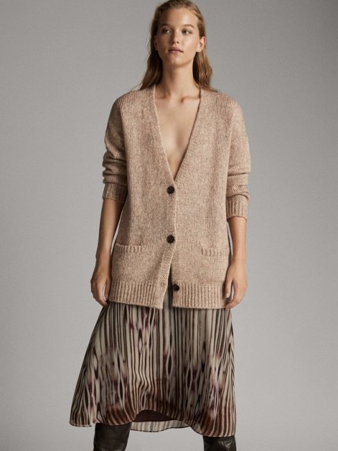 В сезонных коллекциях много кардиганов в бохо-эстетике — такие можно найти у Isabel Marant и Jacquemus, Alanui и Sacai, Missoni и Etro. Вещь с этническими мотивами будет круто смотреться на контрасте с современными силуэтами и фактурами: подойдут, например, широкие брюки. Впрочем, лично мы планируем накидывать кардиган прямо на костюм, ориентируясь на снимок из свежего каталога Zara.