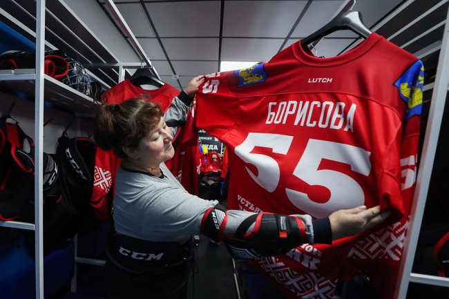 Перед тренировкой в раздевалке спортсменки помогают друг другу шнуровать коньки, «обрастать» многослойной рельефной экипировкой, причесаться под шлем, при этом кто-то из женщин обязательно при помаде. Поверх экипировки — красный свитер с названием команды «Устьяночка», украшенный белым орнаментом. «Когда первый раз форму надели, я ноги не могла закинуть, не гнется защита», — с улыбкой вспоминает нападающая Ольга Филимонова, как делала первые шаги в хоккее.