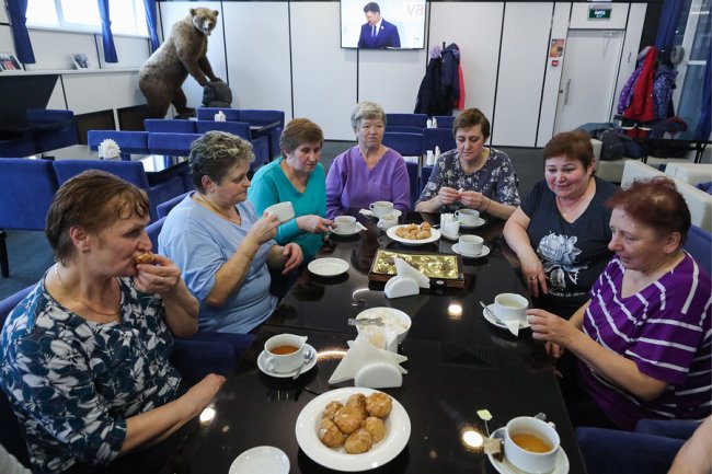 Игроки хоккейной команды «Устьяночка» пьют чай после тренировки. Александр Демьянчук/ТАСС«Мы рады бежать на хоккей, все бросаем и бежим — он нам придает здоровья, энергии, азарта. После игры в хоккей дома любую работу переделаем быстренько. Я пока туда иду — вроде о-о-ой и коленки, ноги дрожат, все какая-то неуверенность. Как только спустилась на лед, немножко проехалась, все забыла!» — делится ощущениями Валентина Павловна.