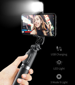 Беспроводная селфи-палка подключается к телефону, фотоаппарату или видеокамере по Bluetooth. У монопода есть подсветка, благодаря которой ты сможешь делать фото и видео даже в темное время суток. Может использоваться как штатив. Устройство совместимо с гаджетами шириной от 65 до 92 мм.