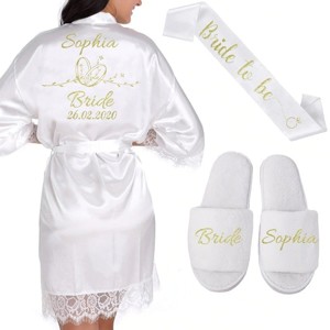 Халат и тапочки, на которых вышито имя невесты, – хит продаж в категории свадебных товаров на AliExpress. Нужно выбрать цвет, размер и сообщить продавцу желаемую надпись. Остальное он сделает быстро и качественно.