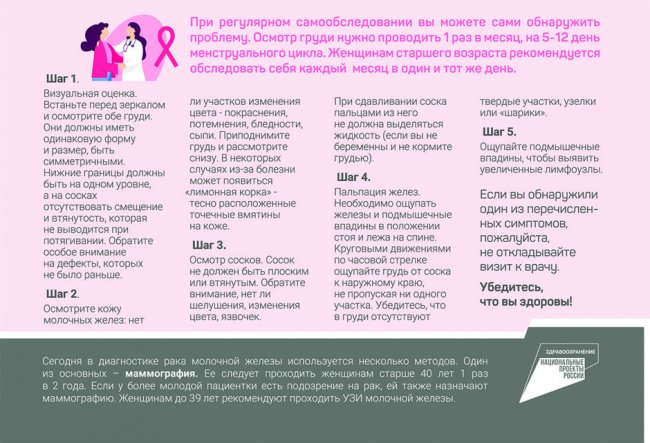 Как показывает практика, 9 из 10 заболевших женщин могут обнаружить опухоль самостоятельно еще до того момента, когда она распространится по организму.Вместе с национальным проектом "Здравоохранение" рассказываем, как проводить самодиагностику в домашних условиях.