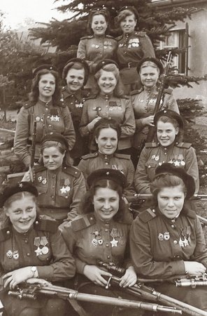 Нет, в кадре не фронтовые медсестры перед новогодним корпоративом. Это одни из самых смелых и эффективных убийц в Красной армии — девушки-снайперы. За их блещущими усмешками — 775 убитых германцев. Изначально русские командиры были не в восторге от идеи привлечь дам к снайперскому труду: мол, в засаде неусидчивы будут, сердитые они, да и вообще любая снайперская винтовка на вес золота, а тут их еще на баб тратить... Не запамятовай, что снайпер иногда днями принуждён был посиживать в засаде, дожидаясь, пока кто-то из германских офицеров на секунду не высунет свою неразумную голову из окопа либо окна, собираясь отправиться с важным заданием в туалет.