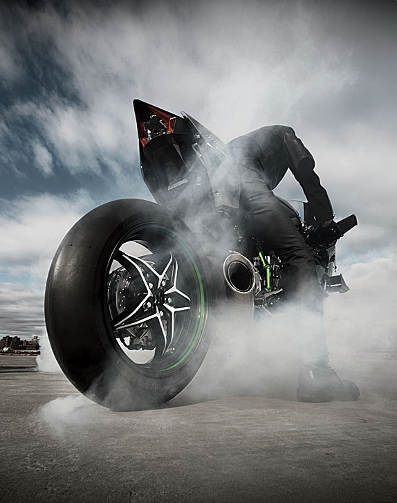 Японские профессионалы оригами уложили в карбоновое тело Kawasaki Ninja H2R аж 300 лошадей(разговаривают, некие были против)! В комплекте 4-цилиндровый движок с жидкостным остыванием. Гоночные слики. Разгон от 0 до 100 км меньше чем за 2,5 секунды. Джереми Той, гонщик-испытатель Kawasaki, поведал, что без заморочек выжал на байке 338 км/ч. Детали корпуса разработаны космическим отделом Kawasaki.