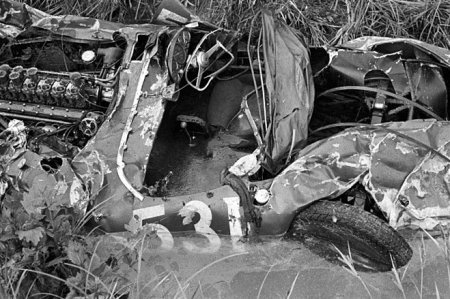 На скорости около 200 км/ч Феррари снес символ и задел телеграфный столб. Оторвавшийся капот разрезал де Портаго на две доли. Затем «Феррари» взмыл в вышину на четыре м., порвав электропровода электропередачи. Машина спикировала в массу, стоявшую с правой стороны дороги. Все вышло за пару секунд, люди не успели ужаснуться либо двинуться с места. Девять человек погибли здесь же, пятеро из их — детки. Скончался и штурман маркиза Эдмон Нельсон.