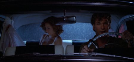 Патрик «Джонни» Суэйзи с уверенным выражением лица ведёт под дождём авто, рычаг переключения передач которого стоит на «нейтралке».
