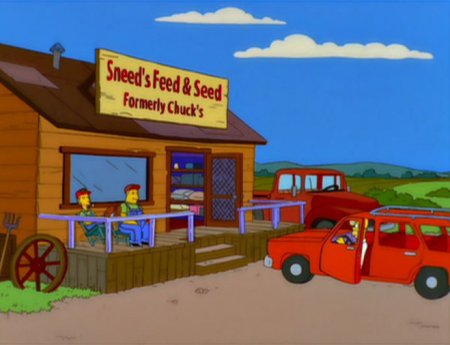 Соль вывески в том, что feed и seed созвучны с фамилией теперешнего собственника магазина Sneed. Подразумевается, что заглавие так же рифмовалось с фамилией предшествующего собственника и звучало как «Chuck's Fuck & Suck»