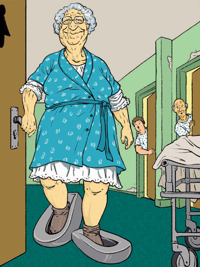 Доставили к нам даму одну. Вроде и старая, а в клинике в 1-ый разов. Сестра ее устроила, а потому что время позже, оставляет ей судно: вот, дескать, ночкой в туалет сходите. «Дай тогда уж и вторую, доченька», — разговаривает бабуля. Ну, сестра плечами пожала ( малюсенько ли какие запросы у пациентов?) и отдала. А на этаже, надобно сказать, лежат старички, дежурства безмятежные. И вот, время издавна за полночь, как вдруг в коридоре раздается жуткий грохот и лязг. Сонные пациенты из палат рассыпали и видят такую картину: следует по коридору давнишняя бабуля, а на ногах у нее надеты два судна!Бабка осматривает эту массу, обретает в ней дежурного и безвинно этак разговаривает: «Так я не сообразила, милок, где здесь у вас туалет-то?»