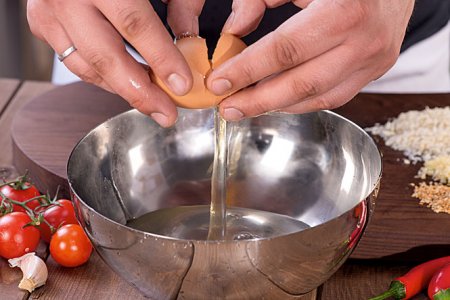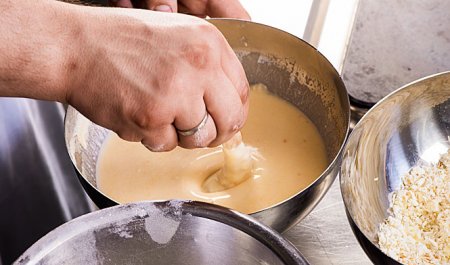 Чтобы сделать кляр, смешай одно куриное яичко, сто г воды и соль.