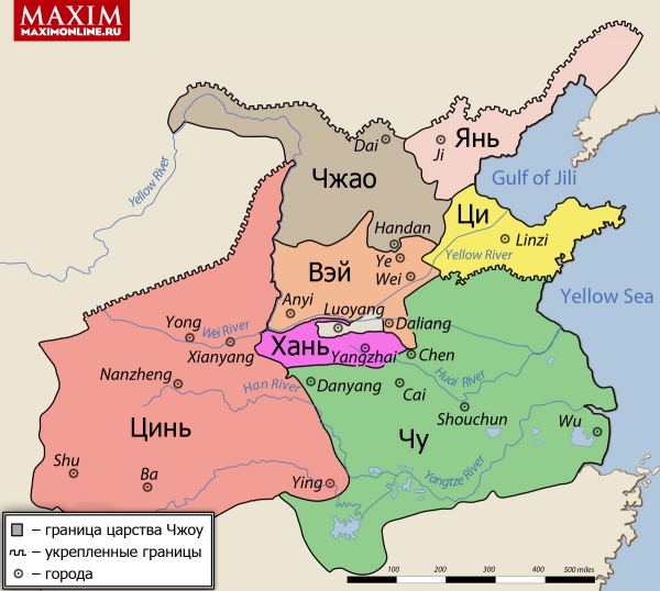 Царство Цинь, верное принципам легизма, чрезвычайно быстро вступило в войну фактически со всеми своими соседями(правда, по очереди). Сражались циньцы мужественно: им деваться было некуда. За боязливость в бою надеялись те самые четыре разрывательные повозки. Все бойцы тоже были поделены на пятерки, и, когда кто-то из пятерки гибнул, голову снимали и с других 4. За погибель командира сотки убивали сотку. За сдачу в плен уничтожали всех родных дезертира. Учитывая, что гражданских наказывали так усердно, что в удачные недельки их гибло больше, чем воюющих, быстро у Цинь начались маленькие трудности с людским ресурсом, которые были блистательно решены. По остальным королевствам был разослан клич: «В Цинь предоставляют землю!Всем!Бесплатно!Приходи и вспахивай хоть какой незанятый пустырь, он будет твоим. На 10 лет — освобождение от налогов, на три поколения — от воинской повинности!»