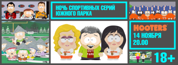 Вечеринка-марафон спортивных серий «Южного парка» пройдет в приятной и полной сексапильных официанток и барменш атмосфере бара Hooters в субботу 14 ноября. За отличное развлечение отвечает Евгений Рыбов, глас русского «Южного парка».