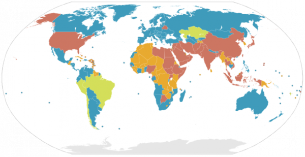 Красным отмечены страны, где смертная казнь практикуется. Остальные цвета — где не практикуется(голубий — отменена, оранжевый — не применяется, зеленоватый — не применяется в мирное время).