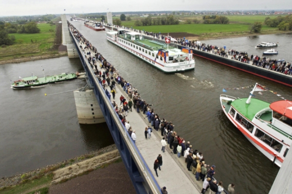 Идея о постройке моста, объединявшего бы два главных судоходных канала — Среднегерманский и Эльба-Хафель, — пришла к германским властям еще поначалу XX века. Но позже стало как-то разом не до строительных работ: поначалу Первая глобальная война, позже Вторая, позже разделение Германии... К проекту возвратились только в 1997 году и к 2003-му Магдебургский мост был достроен. Его длина сочиняет 918 метров. Эта цифра выгодно контрастирует с 12 километрами, которые до строительных работ моста приходилось преодолевать кораблям, чтоб попасть из 1-го канала в иной.