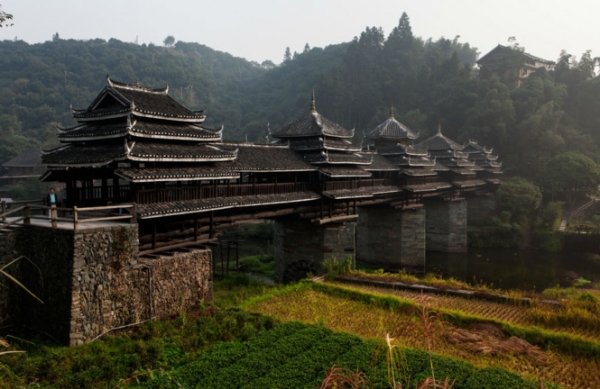 В китайской провинции Гуанси проживало множество наций. Но больше всего неуввязками погоды была беспокоена народность дун, ведь конкретно они выстроили мост, по которому можнож ходить сухим даже в ветреную и дождливую погоду. Можно сказать, что Мост ветра и дождика, перекинутый через реку Линси, принадлежит к новострою(необыкновенно по китайским меркам), потому что сооружен в 1916 году. Его длина сочиняет 64,4 м.. Приятно знать, что при возведении моста ни один гвоздь не пострадал: мастера строители народа дун оказались так талантливы, что смогли подобрать древесные брусья, образцово пригодные друг к другу без доп креплений.