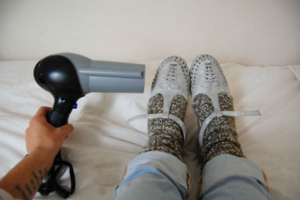 Новая обувь способна доставить досадные чувства даже самым стойким. Пропустить момент с мозолями поможет фен. Надень теплые носки, сунь ноги в туфли и согрей их феном. После этого немножко походи по комнате, пока обувь не остынет. Затем смажь туфли кремом для обуви, чтоб шкура не потрескалась.