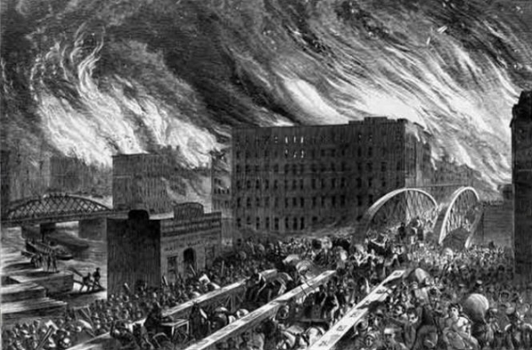 8 октября 1871 года в сарае сзади строения по адресу дома 137 по ДеКовен-стрит загорелось сено. Хозяева дома чета О`Лири совместно с соседями попробовали потушить пожар, но мощный юго-восточный ветер разнес пламенеющее сено по всему кварталу, потом огонь перекинулся через реку, истребляя все на собственном пути. Скорости распространения огня содействовало несколько причин: древесные дома, угольные склады вдоль реки, древесные тротуары, мощный ветер и в целом тепленькая сухая осень. Пожар буянил 3 суток и уничтожил 17500 спостроек, оставив сто 000 человек без крова. Около 300 обитателей Чикаго погибли в огне.