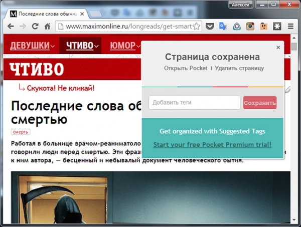Одно из самых рекомендуемых хранилищ для материалов, которые собираешься прочитать позже. Два клика — и интересная статья, на которую сейчас нет времени, оказывается в твоем «покете». Он, в свою очередь, доступен и с компьютера, и с мобильных устройств. Главная проблема: отложенные статьи имеют свойство накапливаться, отпугивая тебя трехзначными числами непрочитанных материалов.