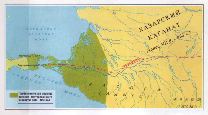 После погрома Хазарского каганата киевским дворянином Святославом город Тмутаракань перешел под власть Киевской Руси, равномерно став самостоятельным русским княжеством. Но удалгнное от Руси положение сыграло свою роль: опосля 1094 года упоминания о Тмутаракани пропадают из российских летописей. Территория переходит к Византии, а позднее к Генуе.