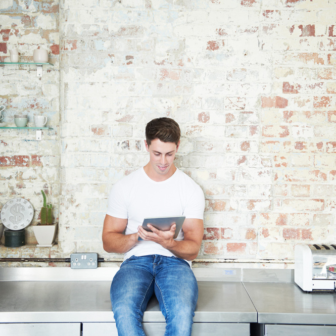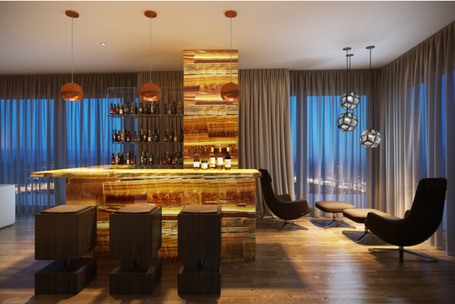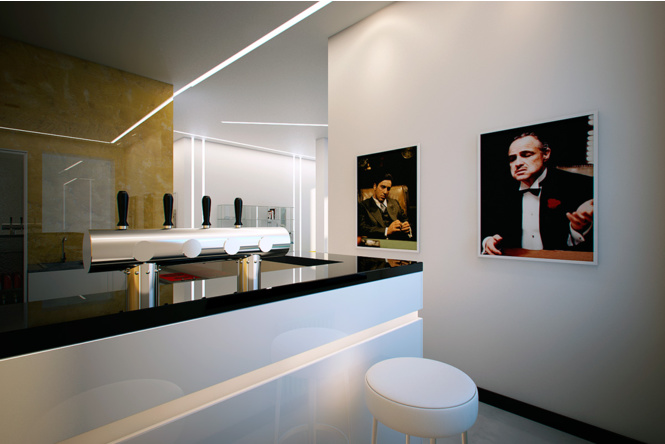 Обеденный стол не догма, ведь мужская кухня — не место для чинных семейных обедов. Ограничься барной стойкой для завтраков и перекусов. Она комфортна и круто смотрится. Ее можнож сделать упором всего интерьера. К образцу, стойка из оникса с подсветкой абсолютно точно попадет в инстаграмы всех твоих гостей.