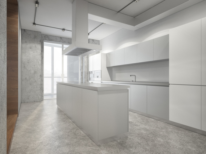 Чем грубее фактура, тем брутальнее интерьер. Штукатурка с имитацией бетонного покрытия как словно умышленно придумана для кухни холостяка.
