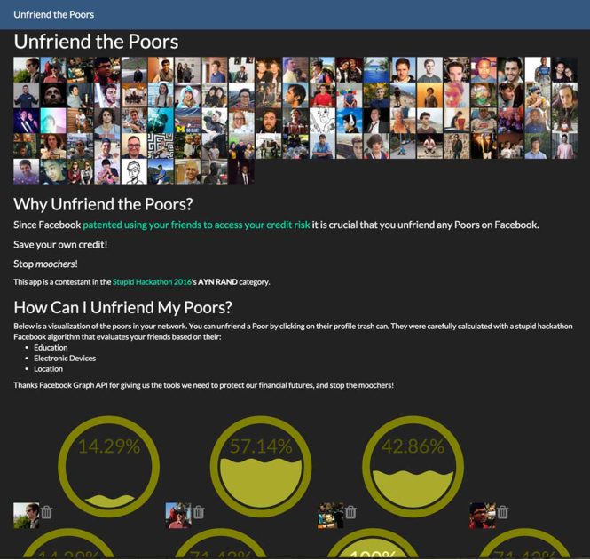 Приложение для «Фейсбука», вычисляющее, кто из твоих приятелей беден(прибавление анализирует, какое образование получил человек, с какими гаджетами фотографируется и в которых местах чекинится). Тех, кого прибавление заподозрит в малообеспеченности, ты можешь удалить одним кликом.