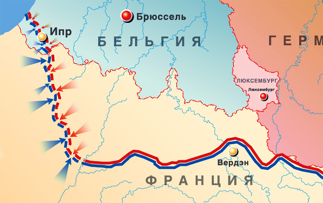 Поражение тевтонов в сражении на Марне стало началом контрнаступления войск Антанты, но скоро силы и резервы с обеих сторон исчерпались. Городок Ипр оказался в центре так именуемой Ипрской дуги: с севера, юга и востока его окружали германские войска, но сам Ипр и ближайшие окрестности удерживали бельгийские, французские и английские бойцы. Такое положение дел сохранялось в протяжении 4 лет войны, так что город был практически вполне стерт с лица земли огнем артиллерийских орудий. Первый разов германцы попробовали завладеть Ипр во время сильной наступательной операции во Фландрии. Город заграждал стратегическое направление, оберегая главные французские порты пролива Па-де-Кале. В конце октября 1914 года бельгийцам пришлось даже открыть шлюзы и затопить морской водой низменную местность близ устья реки Изер, чтоб воспрепятствовать наступлению соперника. К 22 ноября битва закончилась с ничейным результатом: прорыв не удался, линия фронта осталась на месте, вот лишь немцы утратили убитыми и ранеными 134 тысячи человек, а такой же печальный счет у Антанты составил около 162 тысяч.