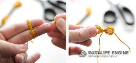 6. Сделайте маленький помпончик из мулине: обмотайте нить вокруг сведённых совместно указательного и среднего пальцев — сделайте около 8 витков. Маленьким куском нити перетяните в центре. Осторожно снимите с пальцев, затяните узел потуже и закрепите ещё одним узлом. Прорежьте концы получившихся петель,