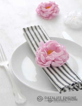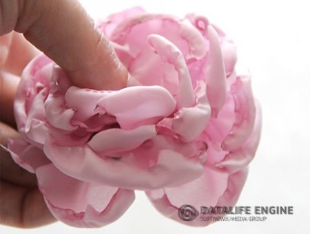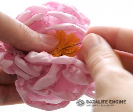8. Поместите помпон в центр цветка и пришейте, прошивая насквозь через все слои ткани. Пион из ткани готов!Им можнож украсить стол либо подарок, клеевым пистолетом прикрепить к базе для броши либо заколки.